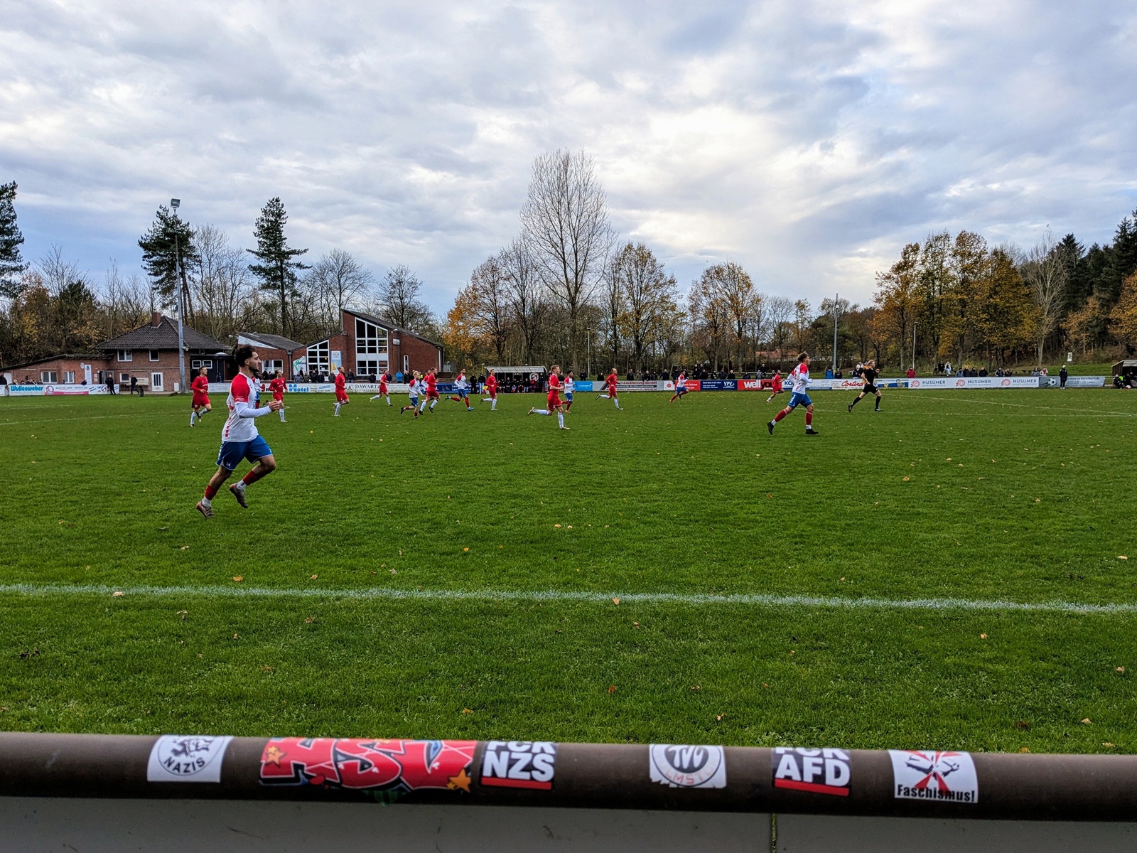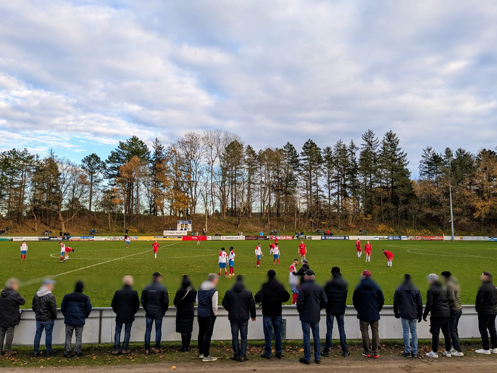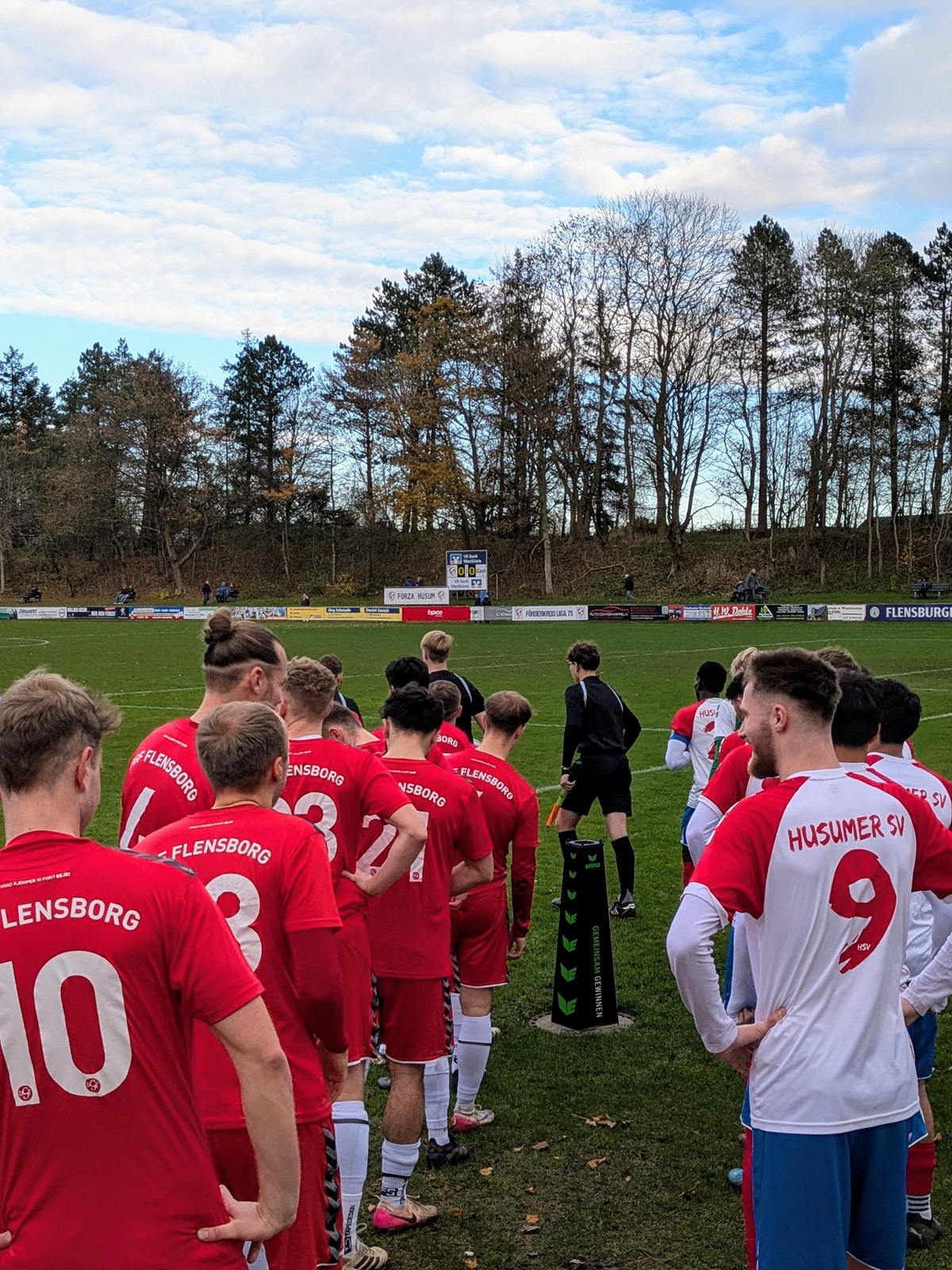 Das Friesenstadion, etwas außerhalb der 25.000 Einwohner zählenden Stadt Husum gelegen, ließ sich gut mit dem Bus erreichen, in dem wir die einzigen Reisenden waren und uns der freundliche Fahrer in astreinem Platt etwas über die Geschichte Husums erzählte… vermute ich zumindest. Die wunderschöne Sportanlage befindet sich in einem Waldgebiet, welches ob der friesisch kühlen Sonne in einem besonderen Glanz erstrahlte. Neben dem Hauptplatz (zum Glück mal kein Kunstrasen), befindet sich noch der etwas verwilderte Nebenplatz mit einer wunderbar analogen Anzeigetafel. Dieser wurde vor der Fusion von Frisia genutzt und ist jetzt der Hauptplatz von Husum 18 (siehe oben).