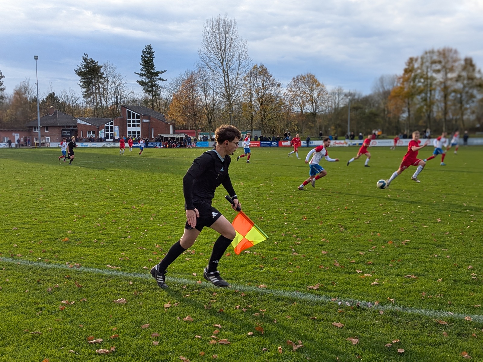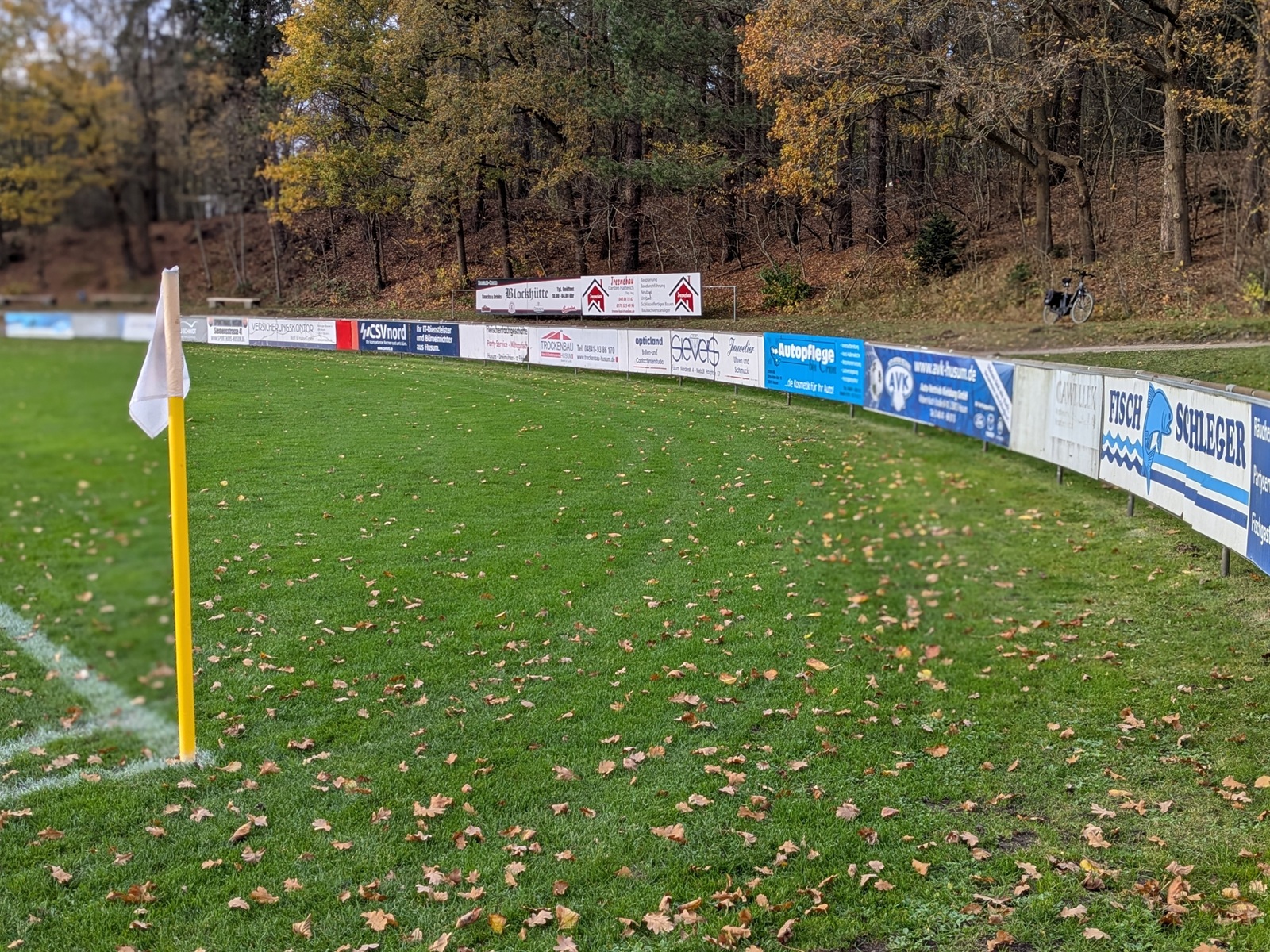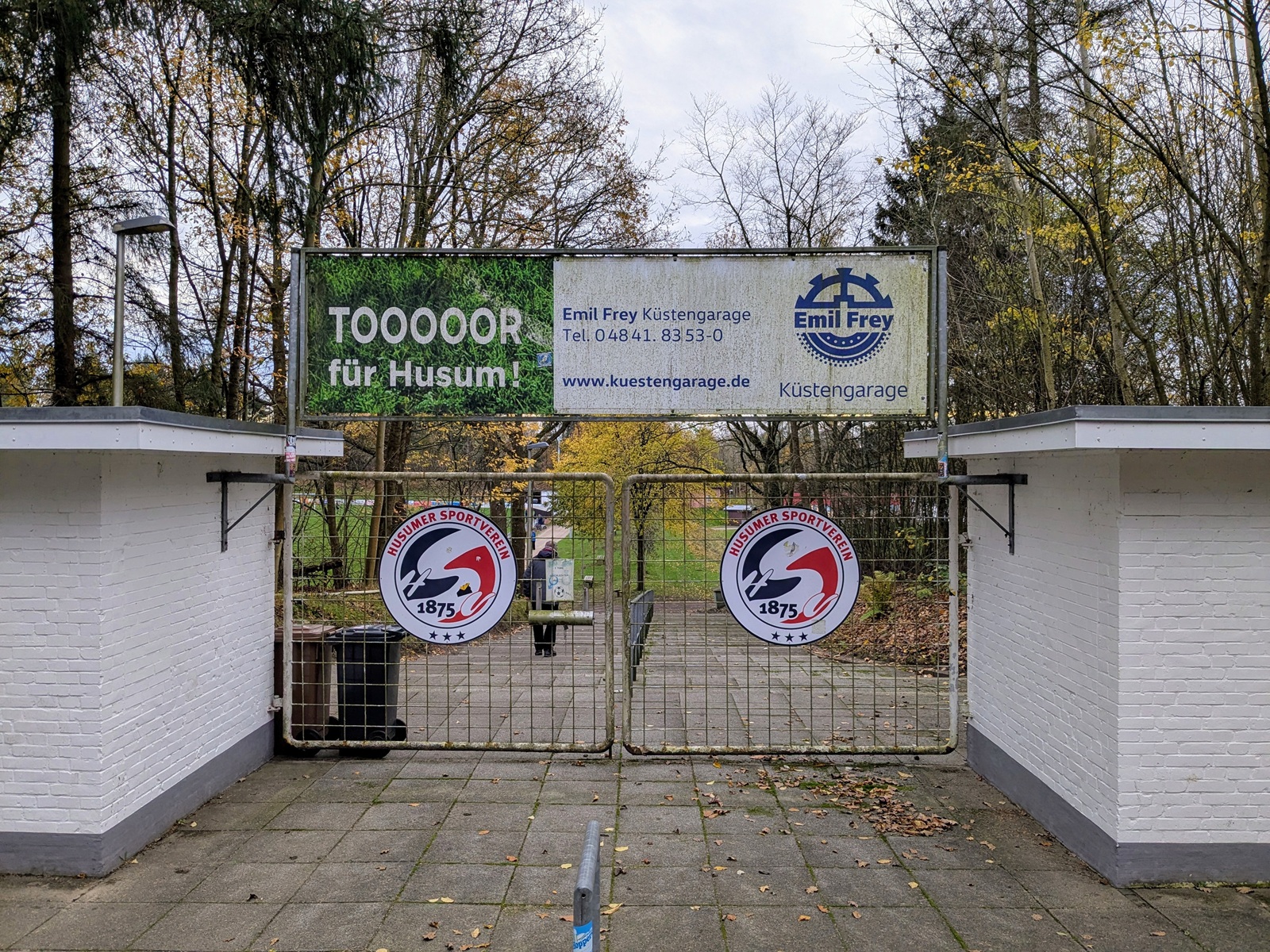 Das Friesenstadion, etwas außerhalb der 25.000 Einwohner zählenden Stadt Husum gelegen, ließ sich gut mit dem Bus erreichen, in dem wir die einzigen Reisenden waren und uns der freundliche Fahrer in astreinem Platt etwas über die Geschichte Husums erzählte… vermute ich zumindest. Die wunderschöne Sportanlage befindet sich in einem Waldgebiet, welches ob der friesisch kühlen Sonne in einem besonderen Glanz erstrahlte. Neben dem Hauptplatz (zum Glück mal kein Kunstrasen), befindet sich noch der etwas verwilderte Nebenplatz mit einer wunderbar analogen Anzeigetafel. Dieser wurde vor der Fusion von Frisia genutzt und ist jetzt der Hauptplatz von Husum 18 (siehe oben).