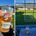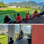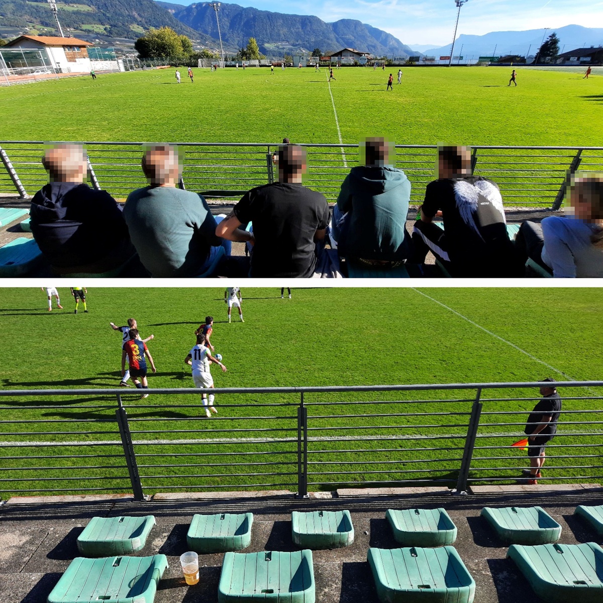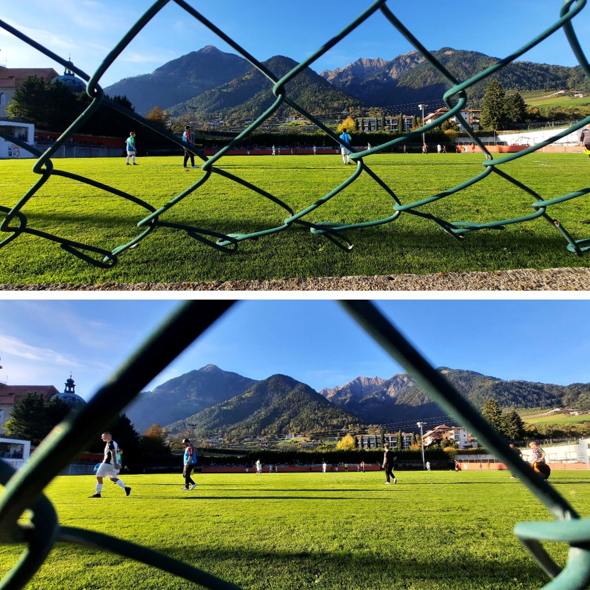 Also den Sportplatz ausfindig gemacht und hingeradelt. Natürlich hoch oben über‘m Tal. Mit einer unglaublich schönen Aussicht! Ich war geflasht. 5€ war mir dieses Ambiente allemal wert. Kurze Erkundung nach Liga, Gegner, Tabellenplatz – und dann mit kleinem Bierchen und nem Mortadellalaugenbrötchen auf die Balkonlounge und die ersten Eindrücke aufgesaugt. Auffällig eng begrenzter, kurzer aber sehr gut gepflegter Ground. Heimische und Gäste sitzen oder stehen gemeinsam auf der „Gegengerade“. Gegenüber ist der Fangzaun recht niedrig, so dass man befürchten muss, dass der Ball bei einer zu hohen Klärung ins Aus 300m runter ins Passeiertal fliegt.